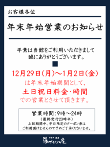 NEWS 2025.12.11 宮前平源泉 湯けむりの庄 年末年始 料金・営業時間のお知らせ 2025年12月29日(月)~2026年1月2日(金)の期間中、入館料・岩盤浴料・営業時間ともに土日祝日扱いとさせていただきます。 平日限定の各種招待券・割引券等はご利用いただけません。 何卒ご理解を賜りますようお願い申し上げます。