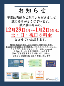 NEWS 2025.12.11 天然温泉 仙川 湯けむりの里』年末年始 入館料のお知らせ 2025年12月29日(月)~2026年1月2日(金)の期間中、入館料は土日祝扱いとなり、 平日限定の各種招待券・割引券はご利用いただけません。 何卒ご理解賜りますようお願い申し上げます。