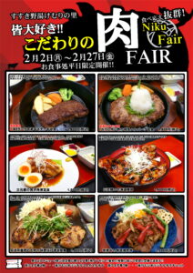 平日限定でボリューム満点のお肉料理が楽しめる肉フェアを実施致します。お肉の質にもこだわった、よりおいしいお肉料理となっておりますので、ぜひお召し上がりください!