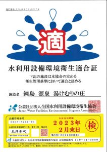 適切な衛生管理(清掃・水質検査)が実施されていると認められる施設へ発行される適合証です。